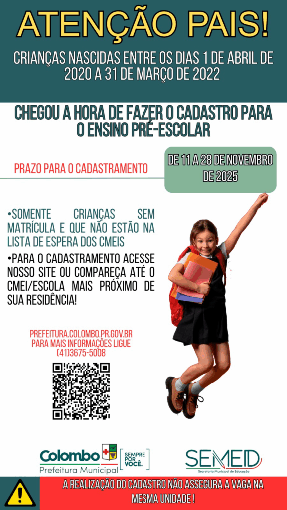 O cadastramento é obrigatório para crianças que completam 4 anos até 31 de março de 2026. Devem ser cadastradas as crianças nascidas entre 1º de abril de 2020 e 31 de março de 2022, que ainda não estão matriculadas na Rede Municipal de Ensino de Colombo.